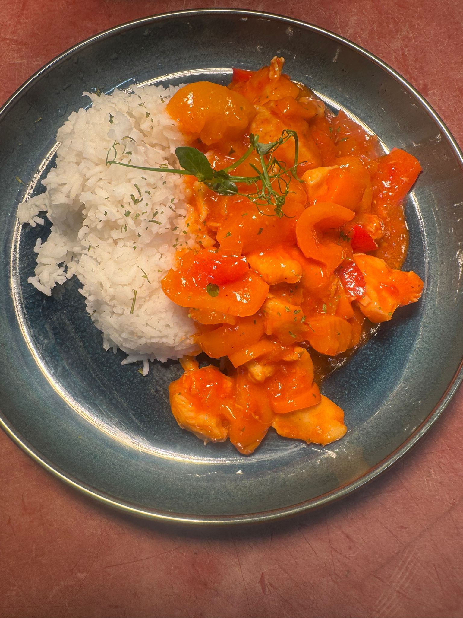 | Ingrediënten | Witte basmati rijst, Kipfilet(Halal), ui, paprika, knoflook, Tomatenpuree ,azijn, suiker ,gembersiroop, chilisaus, perzik, maizena (Glutenvrij) |