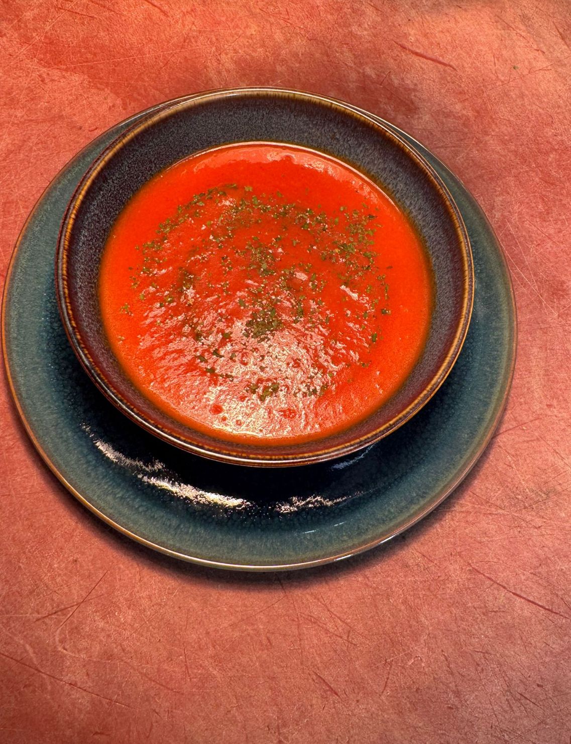 Een klassieke huisgemaakte tomatensoep bereid met verse tomaten en kruiden.